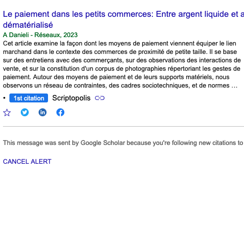 This first, centuries-old form of valorisation is now tending to be overshadowed by a new intertextual relationship: the inclusion of the work in the bibliographic list of another academic piece of writing, which bibliographic databases then transform into citations, accumulating like so much evidence of the relevance of the original text. And these databases offer their authors tools for tracking these traces of scientific credit, as in the image captured above. What has dematerialised money in small shops got to do with Scriptopolis? You’d have to read the text – and therefore have an appropriate subscription – to find out.